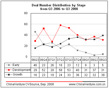 As observed, VC firms continue to prefer high growth enterprises due to the sluggish secondary market. The number of growth and maturity stage deals increased in Q3 2008. 39 growth stage deals secured US$586 Million, representing a 21.9% increase in deal number and a 77.5% increase in investment amount quarter on quarter. The number of growth stage deals surged by 143.8% against Q3 2006, and rose by 18.2% over Q3 2007. The number of maturity stage deals was 11, an increment of 450.0% as compared to Q1 2008. Only 5 seed stage deals were closed, accounting for 6.0% of total deal number (Figure3-1 & Figure3-2).