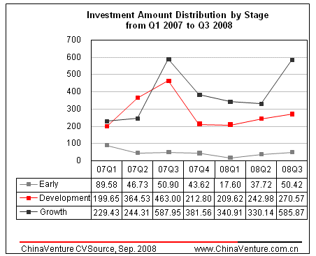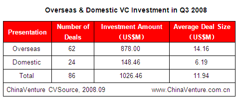 China’s venture capital market maintained a stable development in Q3 2008, witnessing an increase in deal number and investment amount quarter on quarter while a decrement is observed year on year. The total number of deals closed was 86 increasing by 4.9瘯?瘰??瘮?臁瘳???眥?????`??瘱??帉瘱??