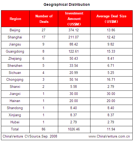 China’s venture capital market maintained a stable development in Q3 2008, witnessing an increase in deal number and investment amount quarter on quarter while a decrement is observed year on year. The total number of deals closed was 86 increasing by 4.9% quarter on quarter but decreasing by 21.1% year on year. Total investment amount stood at US$1.026 Billion, increasing by 51.8% quarter on quarter while decreasing by 6.8% year on year (Figure1.1-1). Amid global capital market turmoil, some financial service giants had filed for bankruptcy. Meanwhile, China’s domestic economy had to be regulated. Under such circumstances, investment firms are becoming more prudent about their investments.
