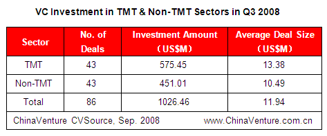 TMT and Non-TMT sectors each witnessed 43 deals in Q3 2008 (Table2.1-1). The TMT sector secured US$575 Million, representing 56.1% of the total investment amount while the Non-TMT sector garnered US$451 Million, accounting for 43.9% of the total investment amount. The average deal size in both sectors rose significantly. Remarkably, the TMT sector witnessed an average deal size of US$13.38 Million, hitting an all-time high (Figure2.1-1). This could be attributed the recent development of TMT companies.