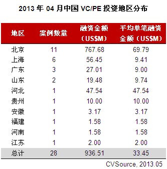 表1 2013年04月中国创业投资及私募股权投资地区分布