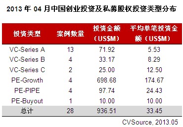 表2 2013年04月中国创业投资及私募股权投资类型分布