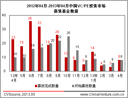 图1 2012年04月-2013年04月中国VC/PE投资市场募资基金数量
