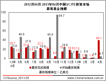 图2 2012年04月-2013年04月中国VC/PE投资市场募资基金规模