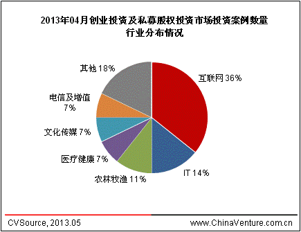 从行业分布来看,4月份VC、PE投资总计28起案例,分布于11个行业。其中,互联网依然是投资最活跃领域,披露案例10起,占比36%。其次分别是IT和农林牧渔行业,分别披露案例4起和3起,其他行业案例均在3起以下。