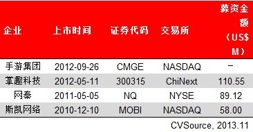 2010年至今,包括“非典型”上市案例——中国手游集团在内,共有4家移动应用企业实现上市,分别为斯凯网络、网秦、掌趣科技和手游集团。其中,中国手游集团(CMGE)采取“介绍上市”方式登陆纳斯达克,并未涉及IPO融资(见表1)。