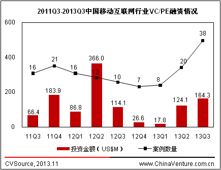 图1 2011Q3-2013Q3中国移动互联网行业VC/PE融资情况
