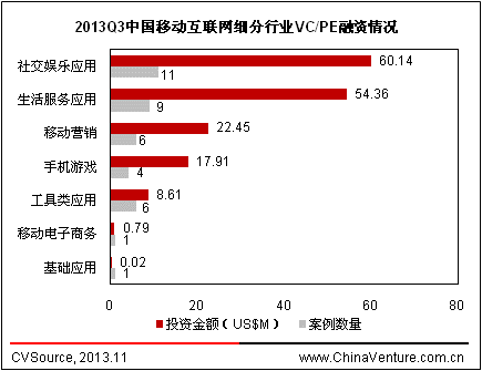 图2 2013Q3中国移动互联网细分行业VC/PE融资案例情况