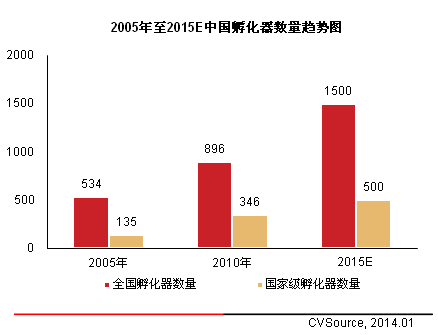 自1987年6月我国第一家孵化器武汉东湖新技术创业中心成立至今,孵化器在国内已走过26个年头,在这其中国家层面对孵化器的政策扶持及税收减免使得全国范围内孵化期数量骤增,孵化器数量由2005年534家增至2015E的1500家,复合增长率高