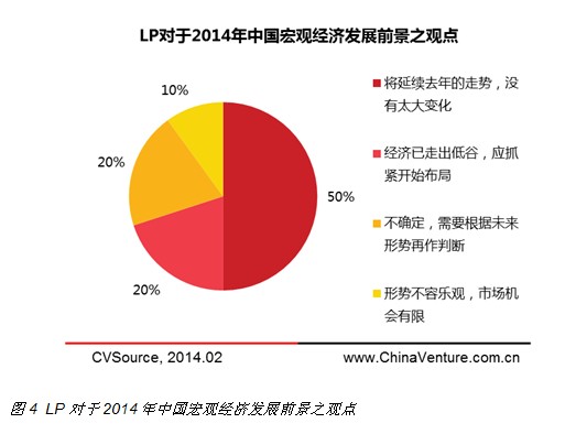 对宏观经济形势的判断,将直接影响LP未来资产配置调整及PE投资决策。对于2014年中国宏观经济发展,50%的受访者认为将持续去年的走势,20%受访者认为目前“经济已走出低谷,应抓紧开始布局”,20%受访者保留观点,认为“需要根据未来形势再做判断”,10%的受访者认为“形势不容乐观,市场机会有限”(见图4)。