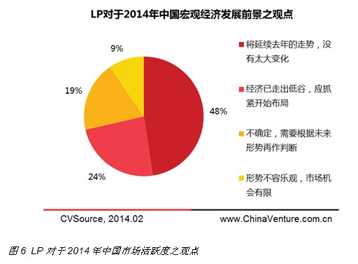 对于2014年中国创业投资及私募股权投资市场活跃度,投资人普遍持谨慎态度。受调查LP中,48%认为“市场处于调整阶段、存在较大风险”,24%的受访者认为“市场活跃度将持续增长”,19%的受访者认为“需根据未来形势再做判断”,9%的受访者认为“形势不容乐观,市场机会有限”(见图6)。