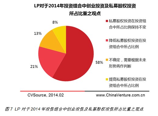 关于投资组合,“保持投资组合中PE投资占比不变”的LP占比仍然最高,达到64%,但这一比例相比2013年度调研提高了20个百分点,可见,投资者对于VCPE投资市场的信心开始有所增加。在本届调研中,拟降低PE在投资组合中比例的LP占比达到21%,相比去年增加了6个百分点,而拟提高PE投资比例的LP比例仅为8%。另有13%的受访者认为“需要根据未来形势再做判断”(见图7)。