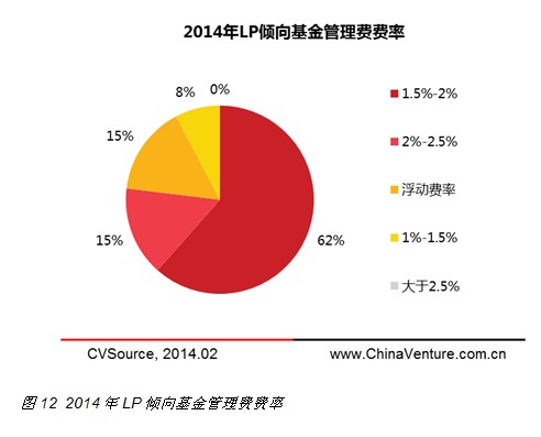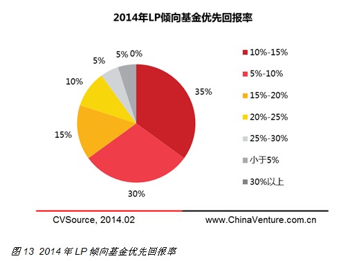 对于基金优先回报率,LP观点同样呈现出多元化特点。选择有限回报率为10%-15%的LP占比为35%,选择5%-10%的LP占比为30%,相比2013年大幅提高,选择15%-20%的LP占比为15%,选择20%-25%的LP占比10%,相比去年均有所下降(见图13)。对于回报率设计的迥异态度体现了LP群体对于市场预期表现的不同判断,以及LP更愿意其投资具有债权属性或股权属性。