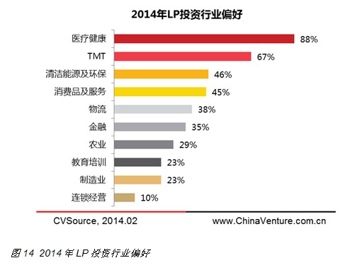 从投资的行业偏好来看,过去两年间VC/PE投资市场的热门领域也同样受LP关注。如医疗健康、TMT、消费服务、清洁能源等LP选择比例较高的行业,其在2013年投资数量行业分布中也同样处于领先地位。
