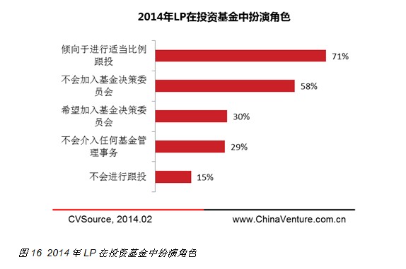 对于LP在所投资基金管理中扮演的角色,多数(71%)投资人希望能够进行适当比例的跟投,而对于基金管理的实际参与则并不积极,58%受访者明确表示“不会介入任何基金管理事务”,该比例与2013相比基本相同,仅有30%受访LP倾向于加入基金决策委员会。纵向比较近几年调研结果,倾向于参与基金管理事务的LP占比逐年下滑,显示出中国市场LP群体投资理念正逐步走向成熟(见图16)。