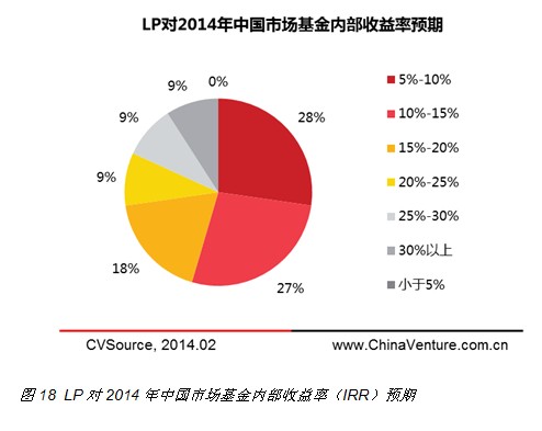 对于2014年中国基金市场内部收益率预期,受访LP观点较为分散,28%受访者预期收益率为5-10%;27%受访者预期收益率为10-15%;18%受访者预期收益率为15-20%;9%受访者预期的收益率为20-25%,另有9%受访者预期收益率为30%以上。与2013年相比,2014年LP预期收益率水平持续下滑,这也符合目前LP对中国VC/PE普遍谨慎的投资态度。