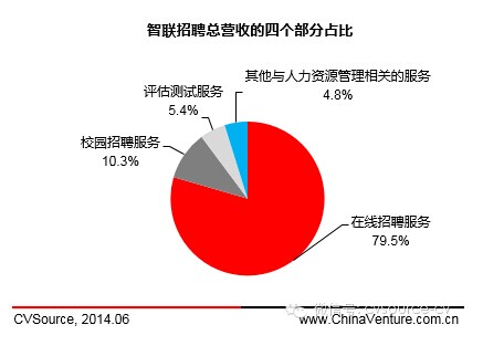 智联招聘的总营收方面主要分四个部分:在线招聘服务占比 79.5%;校园招聘服务占比 10.3%;评估测试服务占比 5.4%;其他与人力资源管理相关的服务占比 4.8%。
