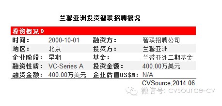 2000年10月,兰馨亚洲投资智联招聘。