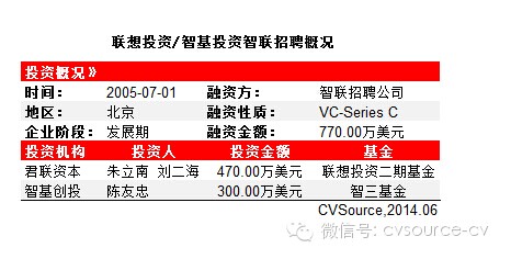 2005年7月,联想投资和智基创投共同投资智联招聘,总金额为770万美元。