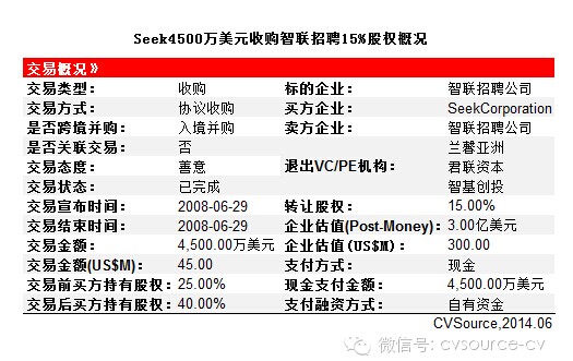 2008年6月,智联招聘获得SEEK公司注资4,500万美元。SEEK持有智联招聘的股份增至40%。兰馨亚洲,联想投资成功退出,其中联想投资的联想投资二期基金获得了2.4倍的回报率。