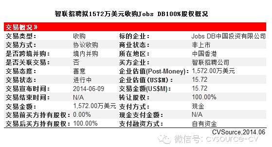 2014年6月9日,智联招聘公司拟以1,572万美元收购Jobs DB中国投资有限公司100%股权。而在招股书文件中已经披露,智联招聘将从英国Jobs DB公司手中接管其在中国的业务,Jobs DB最擅长的便是大数据挖掘方面的技术。