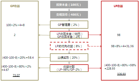 假设基金规模为100元,其中GP认购2元,LP认购其余98元,4年退出,退出现金400元,收益分配计算如下(见图2):