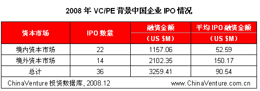 由于审批程序相对简单、投资回报更为丰厚,IPO历来是国内外VC、PE投资机构退出的首选路径。但在国际金融市场萧条、境内外资本市场新股发行持续萎缩的大环境下,IPO退出变得越发艰难。据ChinaVenture统计,2008年全年共有36家VC/PE背景中国企业IPO,较去年同期相比降幅达到62.5%;平均IPO融资金融为9053.92万美元,同比下降73.5%;共有66家机构通过IPO实现退出,IPO平均投资回报率则为1.98倍,同比下降63.8%。