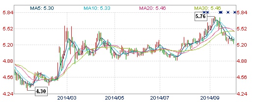 图 2.1 :2014年中国石化(600028)股价走势图,摘自新浪财经