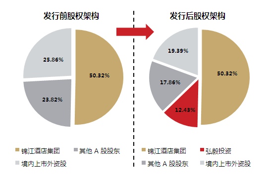 2014年6月,上海锦江国际酒店发展股份有限公司(简称“锦江股份”)(SH.600754)发布公告称,以15.08元价格,向弘毅投资发行1亿股,向锦江酒店集团发行1.13亿股,共募集约30.35亿元。其中10亿元用于择机偿还短期银行借款,提高资产质量、改善财务状况,其余资金将用于补充本公司主营业务有限服务型酒店未来三年业务规模及门店发展所需资金。弘毅投资、锦江酒店集团认购的本次非公开发行的股票自本次发行结束之日起 36 个月内不得转让。