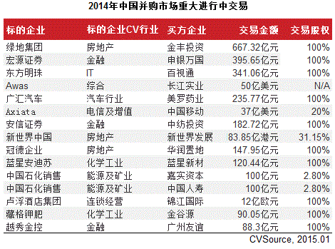 表1 2014年中国并购市场重大进行中交易