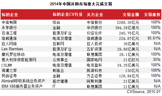 表2 2014年中国并购市场重大完成交易