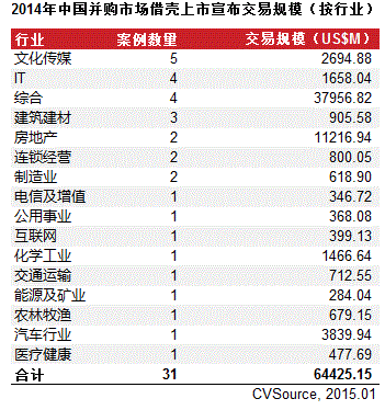 在2014年的并购热潮中,借壳上市案例仍屡见不鲜,热度不减。根据CVSource投中数据终端显示,2014年宣布交易中,借壳上市案例为31起案例数量与去年持平,而宣布交易规模却达到644.25亿美元,远超2013年的210.92亿美元。就行业分布来看宣布案例主要集中在文化传媒、综合、建筑建材等行业(见图3、表3)。