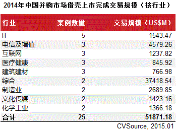 表4 2014年中国并购市场借壳上市完成交易规模(按行业)
