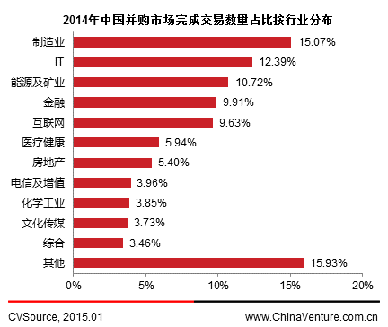 图5 2014年中国并购市场完成交易数量占比按行业分布