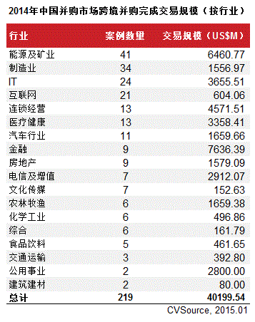 表7 2014年中国并购市场跨境并购完成交易规模(按行业)