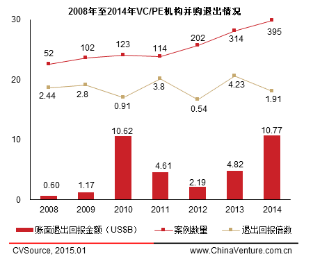 2014年度共实现395笔并购退出,并购退出案例数量达到历史最高值,合计获得账面退出回报金额为107. 3亿美元,平均退出回报倍数为1.91倍。