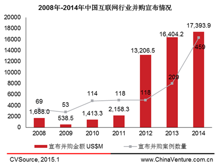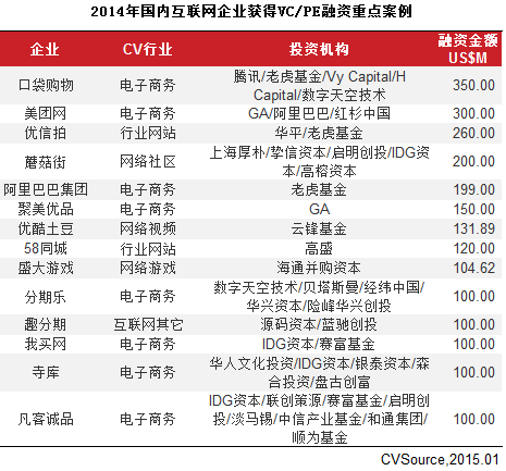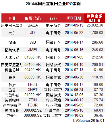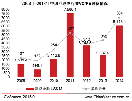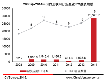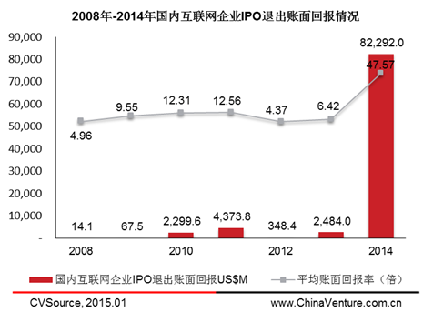 2014年,互联网行业融资、IPO、并购活跃,根据CVSource投中数据终端显示,互联网行业融资案例584个,其中披露金额的61.13亿美元,同比增长131.74%;互联网IPO15家,募集金额285.76亿美元;退出方面,互联网行业退出69例,披露账面退出回报共825.52亿美元,同比增长2817.33%,平均账面回报22.01倍。