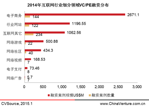 图2 2014年互联网行业细分领域VC/PE融资分布