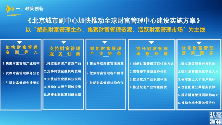 去年5月,市金融局、北京“一部两局”为支持城市副中心高质量发展,联合印发《关于推进北京全球财富管理中心建设的意见》,对城市副中心全球财富管理中心建设作出了进一步指导和部署。通州区政府正式发布《加快推动全球财富管理中心建设实施方案》。