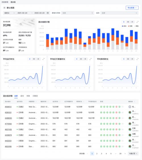 业务需求,从提出到开发,要多久上线%3F这是每个研发人员都必须面对的挑战。极狐星全面呈现流水线总数、成功/失败流水线个数及分布占比、平均运行时长及频率、红灯平均修复时长与等待时长等,「绝对值」横向展示数值 +「数据趋势」纵向对比,流水线效率尽在掌握。另外,极狐星支持原始明细数据导出,为后续深度分析奠定基础。
