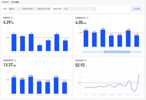 极狐星率先引入国际领先的 DORA 交付指标体系,自动化展示 DORA 核心指标数据趋势与平均值,通过「变更前置时间」+「部署频率」掌握研发对业务需求的响应速度,通过「恢复服务时间」+「变更失败率」验证服务稳定性及故障响应程度,确保团队「效率」与「稳定性」间找到最佳平衡点,软件交付又快又好。