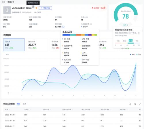 微观层面,极狐星支持对单一项目诊断分析,以时间维度展示合并请求、议题、流水线等数据趋势,更有极狐独创「项目成熟度」、「项目活跃度」指标,实时对项目全方位健康体检。