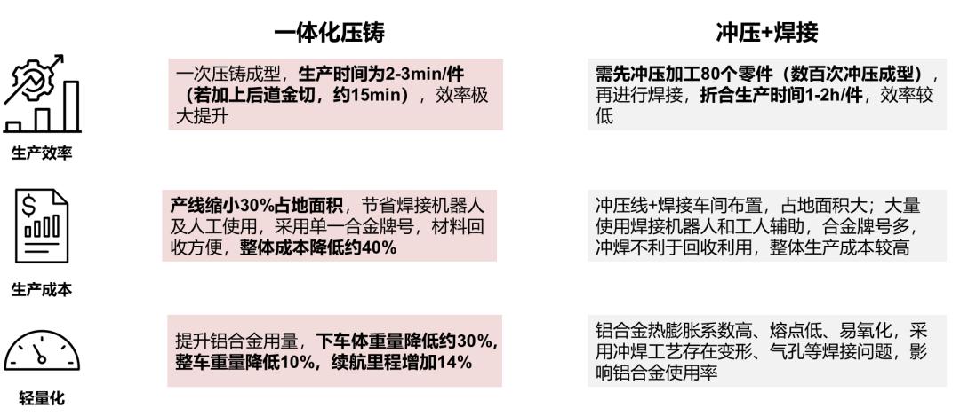 不管是铸造,还是一体化压铸技术,都是非常传统的技术,但特斯拉把它带到了汽车行业这一新的应用场景,跟原来的冲压和焊接方式相比,可降低成本,提升性能,为传统技术带来了新的机会。尤其是在新能源汽车行业带来新的变革。