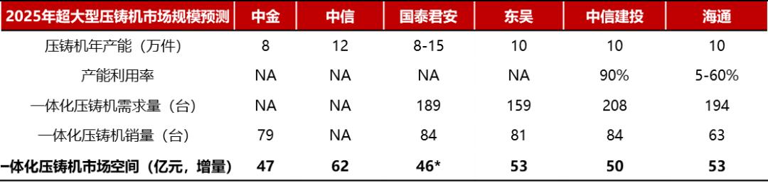 超大型一体化压铸机市场空间预测,数据来源:各券商研报