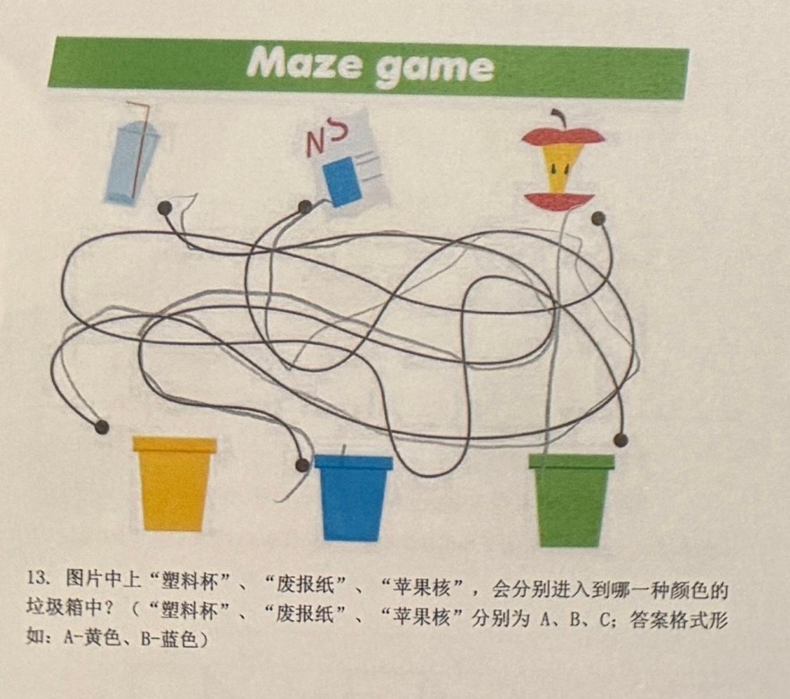 三件物品沿着线分别连到哪个颜色垃圾桶?
