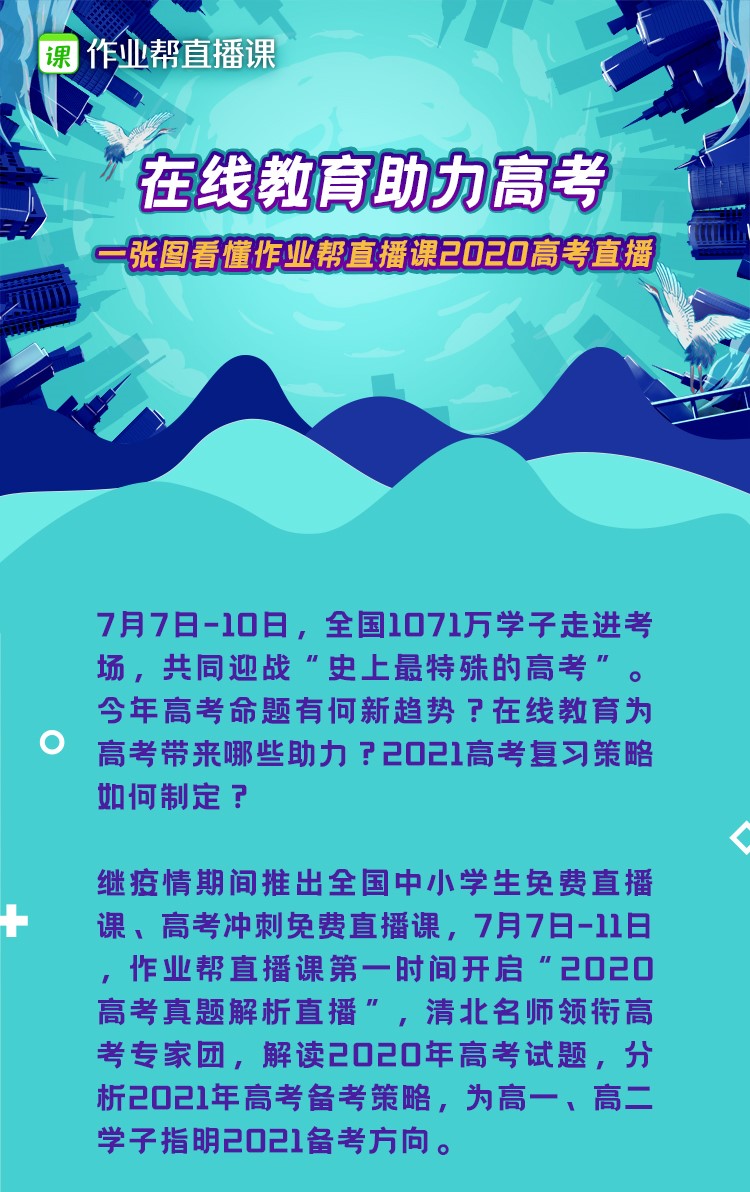 7月7日至11日,作业帮直播课重磅推出高考解析直播,全网用户通过作业帮APP、作业帮直播课APP、作业帮直播课小程序、人民日报客户端、百度、知乎、新浪微博、B站、抖音、快手等平台进入直播课程。