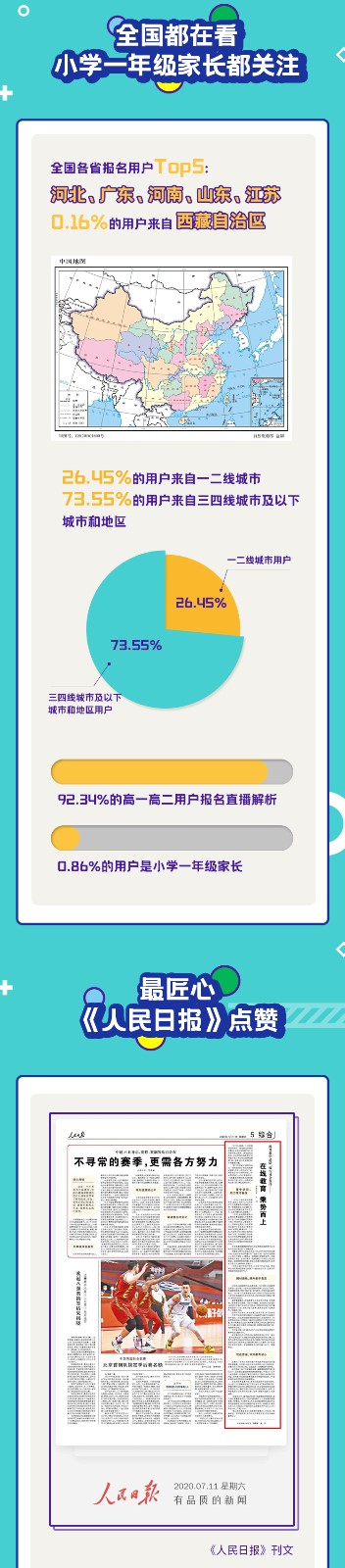 7月11日,高考直播结束当天,《人民日报》刊发《在线教育 乘势而上》专题报道指出,“新冠肺炎疫情防控期间,各地无法如期开学,纷纷推行线上教学。高考宣布延期后,作业帮等在线教育平台相继为高三学生推出免费直播课,线上教育成为护航高考学子的重要力量。”