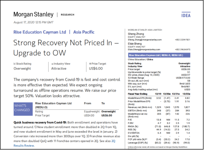 8月17日,摩根士丹利发布研究报告,对瑞思教育(纳斯达克股票代码:REDU)给出“超配”评级(Overweight),并大幅调高对其盈利预期,目标价格上调50%。