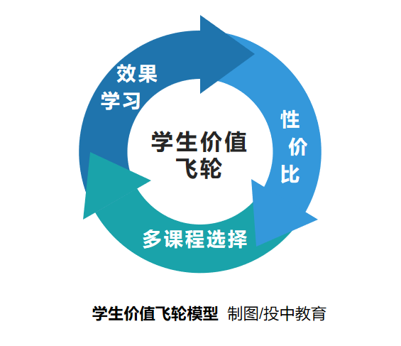 而当一个学习体系能够同时满足这三者要求时,它们之间又会互相促进,形成一个正向循环的学生价值飞轮。一开始,要使轮子转起来必须费很大力气,但此后轮子会越转越快,直至形成依照惯性高速转动的飞轮,激活家长不断复购。