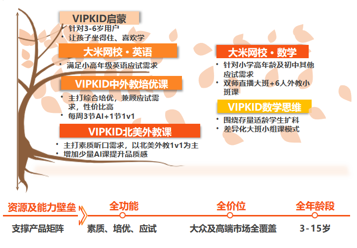 再说增量用户。今年以来,VIPKID陆续推出了大班课产品大米网校,以及满足高年级学生应试需求的中外教培优课,全面拓展K12领域的业务线。